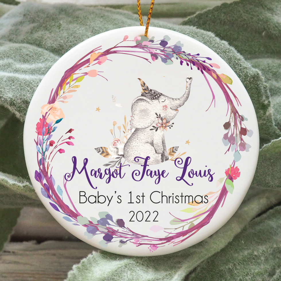 Custom Christmas Ornament. Newborn Christmas Ornament. Newborn ornament. Baby ornament. Baby girl ornament. Boho elephant baby ornament.