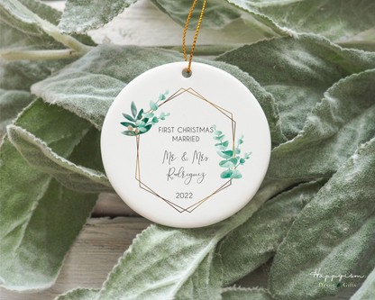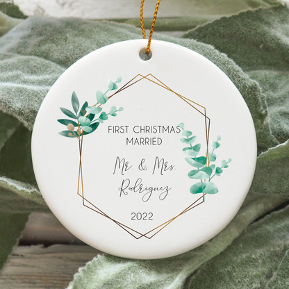 Custom Christmas Ornament. Newlywed Christmas Ornament. Beautiful watercolor leaf design with the phrase "Our first Christmas as ___ & ____ [Last name] and the year included.
