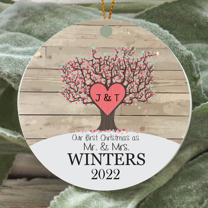 Custom Christmas Ornament. Newlywed Christmas Ornament. Beautiful tree design with initials in tree.