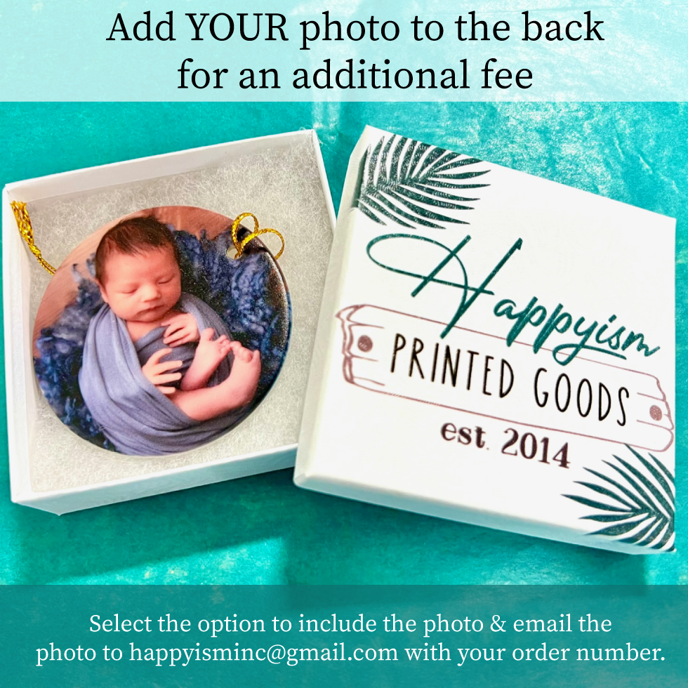 - *Optional* Photo printed on one side of ornament for an additional fee