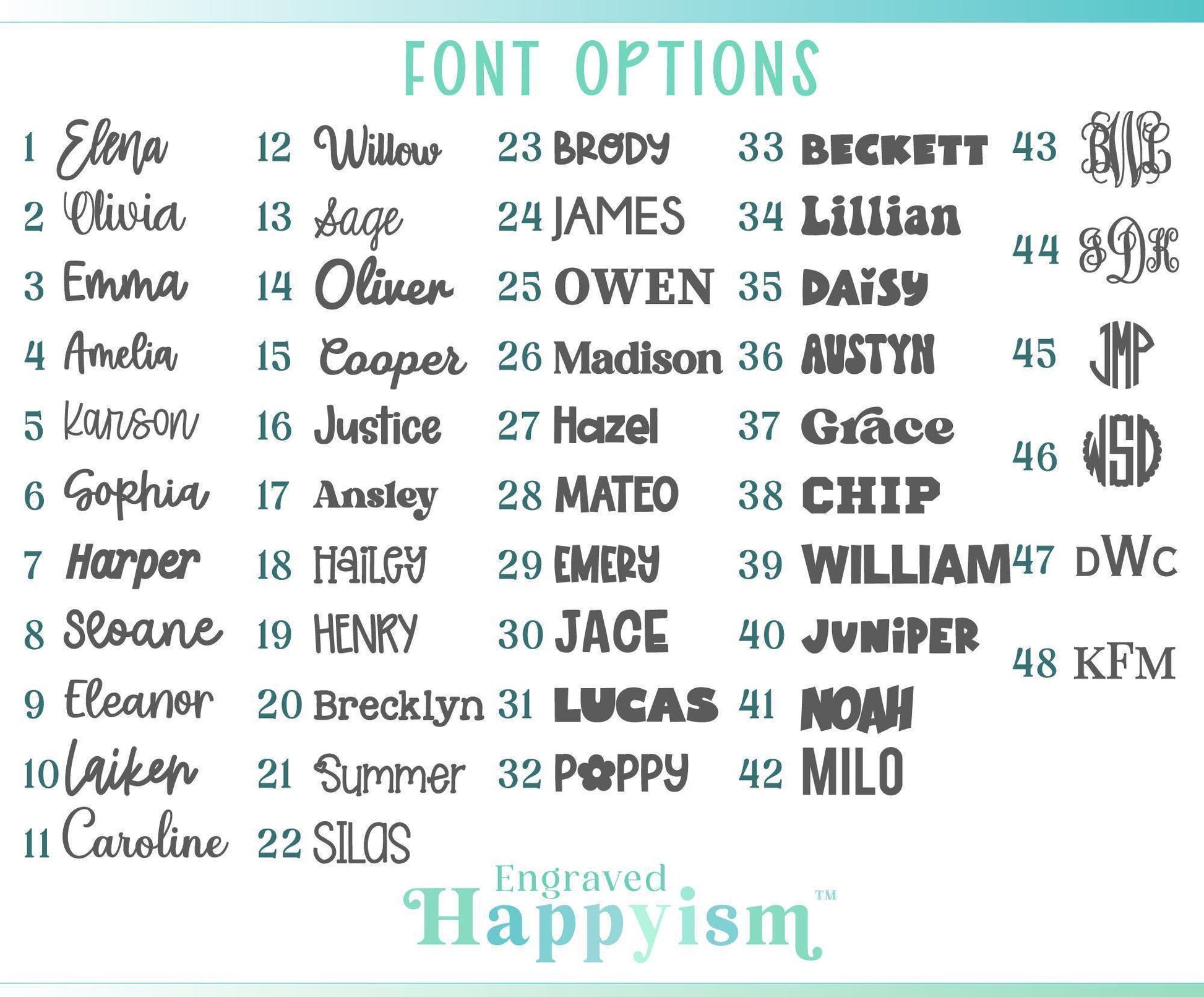 • Size: 1–1.5” tall x up to 5” wide (varies by name length)