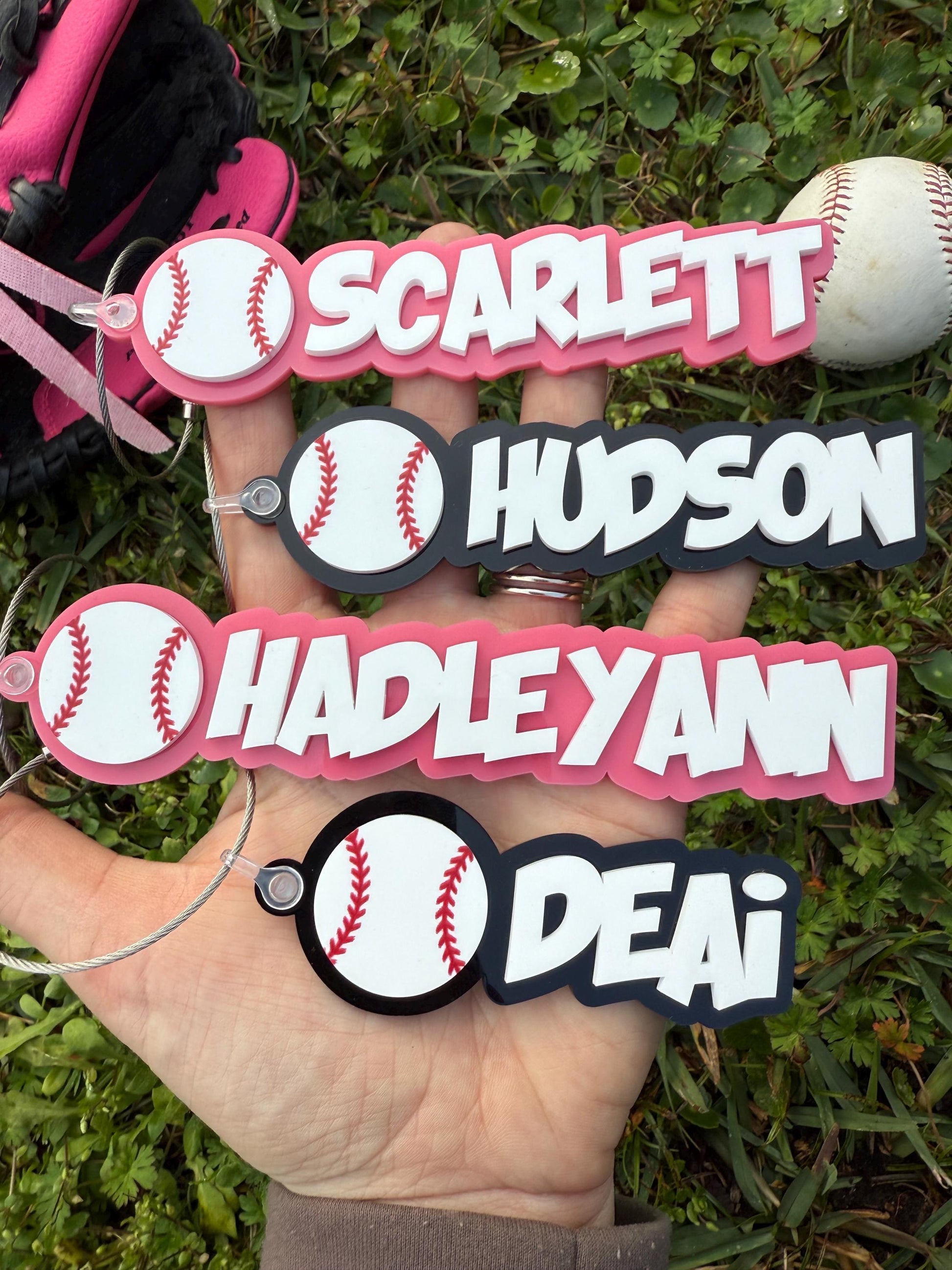 • Design: Raised acrylic name + baseball or softball accent